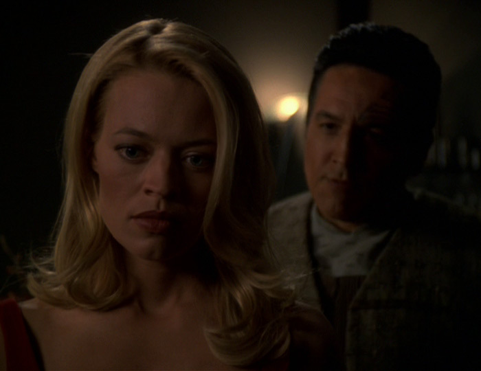When she walks up to the mirror to see herself we see a sense of pride in her eyes as she stands in her own quarters. Her room is dimly lit with fuchsia and blue highlights. A stunning image of a star cluster also hangs on her walls. As Seven looks at herself she sweeps her hair to the side as she is dripped in red from shoulder to toe. The red velour dress worn in this episode was one of the most sensual yet becoming dress shown in a romantic setting. As the scene progresses holo-Chakotay arrives and both of them share a few flirtations as they begin cooking in her state-of-the-art kitchen. He comments on the music softly playing in the backdrop and it is revealed Seven has an interest in music, most notably Chopin. The courting between the two and romantic aesthetic of the evening was something rare to see on television. Most series would skip such pleasantries and go down a rabbit hole of negativity or unnecessarily sexualize them. However, Voyager did not. As the evening cascades, Seven stops what she is doing and takes ahold of holo-Chakotay's face and comments "remain still" followed by you have an intriguing facial structure" (which is so very Seven of Nine to say). As she explored his face and tenderly touched it, her innocent inquisitive nature truly showed where most of the time she was stern, cool and directly to the point. We then prepare ourselves for the grand moment in which Seven kisses holo-Chakotay and the two hold eachother in a loving embrace. She hears a metal sound and he asks "what's wrong" whereupon she replies "nothing". The scene fades like an Old Hollywood film and cuts to black.