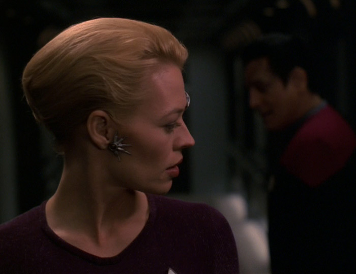 Throughout the saga of "Human Error" we see Seven of Nine truly express her own individuality in a way that she had not done before. Starting first in light purple top with her hair coiffed in a pony tail she later dons a smart science-level Starfleet uniform climaxing to a stunning red dress with her hair down. In the meantime, Voyager is traveling through a weapons testing field which gives the viewer sole focus on Seven and not the other characters. The episode gives just enough screentime towards both plots which do not overshadow eachother. A scene in Astrometrics touches on Seven wanting to improve her social skills when invited to the real baby shower for B'Elanna and Tom. The latter chides a crass joke "what's the problem Seven? No baby showers in the collective?"